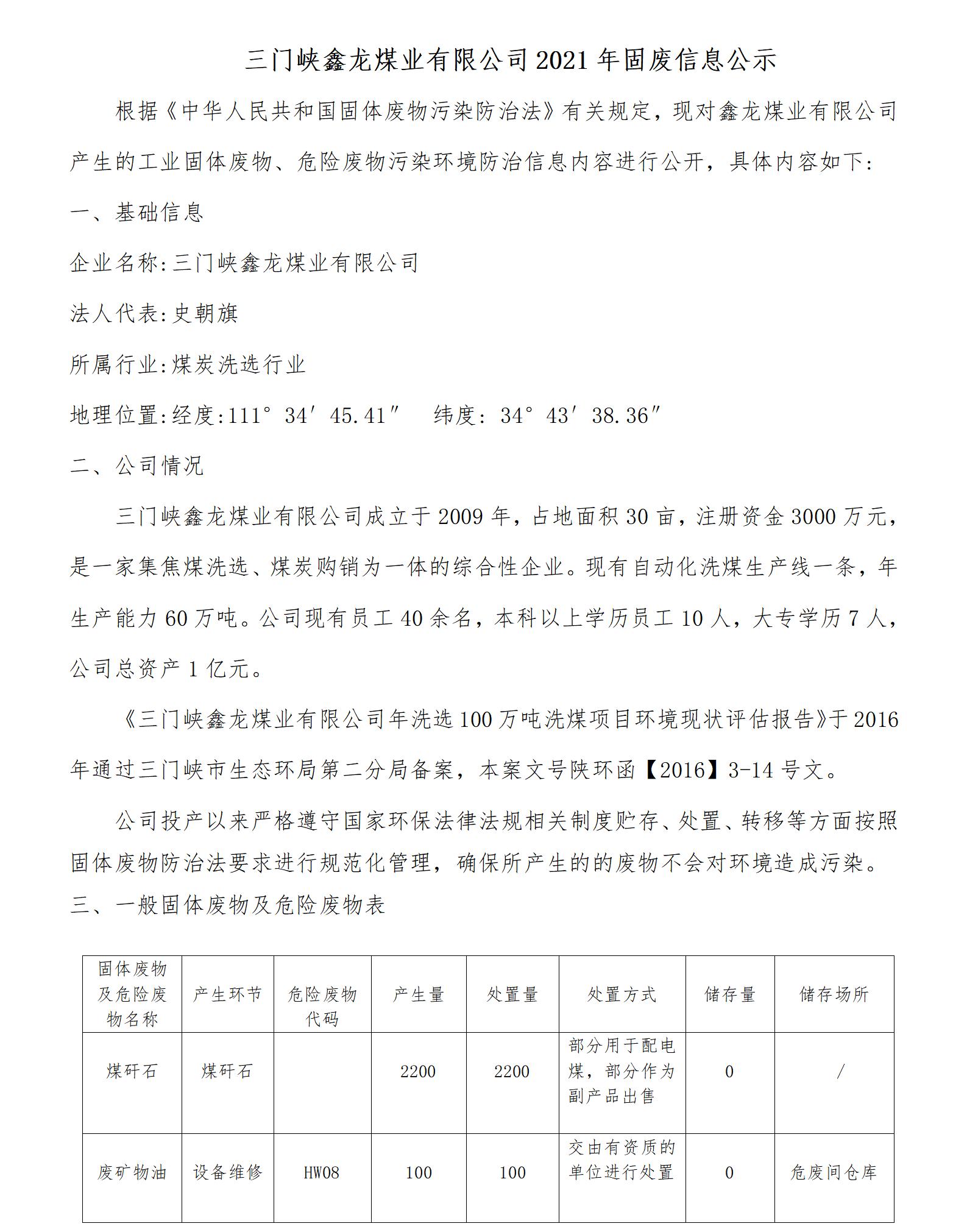三門峽鑫龍煤業(yè)有限公司2021年固廢信息公示